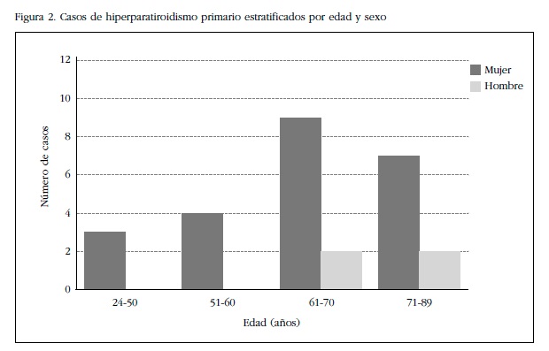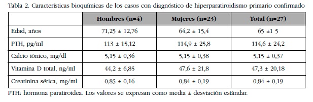 Resultados: Se encontró 61 casos con la PTH elevada al menos en dos ocasiones diferentes. Entre estos, 34 presentaban insuficiencia de vitamina D y fueron excluidos del análisis. En 27 casos (4 hombres y 23 mujeres) se confirmó el diagnóstico de HPTP. La edad media en mujeres fue de 64,5±15,4 años y en hombres de 71,3±12,8 años; los valores de PTH medios fueron 115±24,2 pg/ml; de calcio iónico, 5,15±0,4 mg/dl; de VD total, 47,1±20,2 ng/ml; y de creatinina sérica 0,84±0,2 mg/ml; La prevalencia de HPTP corresponde a 2 casos por mil adultos (IC 95%: 1,71-2,18). El mayor incremento en la prevalencia ocurrió en mujeres ≥60 años.