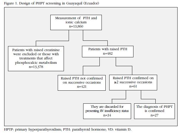 El presente sería el primer estudio para evaluar la prevalencia del HPTP en la ciudad de Guayaquil (Ecuador), aplicando un cribado bioquímico uniforme, por medio de la medición simultánea de hormona paratiroidea (PTH) y calcio iónico sérico, y comparar nuestros resultados con los reportados en la literatura internacional.