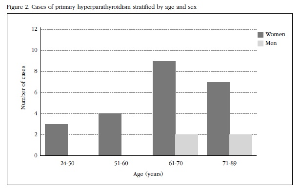 Los casos con un nivel de calcio y/o PTH elevados solamente en una ocasión se consideraron espurios y fueron excluidos. Se excluyeron también los casos con elevación de la creatinina sérica, malabsorción, hepatopatías crónicas, insuficiencia de vitamina D o los que estuvieran recibiendo tratamientos que pudieran alterar el metabolismo fosfocalcico y/o los niveles de PTH (glucocorticoides, estrógenos, bisfosfonatos, tiazidas, litio, calcio). Todas las mediciones bioquímicas se realizaron en un solo laboratorio de referencia. Fueron incluidos en la muestra de cribado todas las mujeres y hombres de 20 años o más. El rango de edad osciló entre 20 y 89 años. Estratificamos los casos por sexo y grupos de edad: 24-50, 51-60, 61-70 y 71-89 (Figura 2). Los datos se expresan como medias y desviaciones estándar con los intervalos de confianza correspondientes, nivel de confianza 95%. Para la comparación de grupos utilizamos la prueba t de Student para medias independientes. Se consideró con significación estadística un valor de p<0,05. La prevalencia de la enfermedad se calculó como el número de casos existentes dividido por la población cribada y expresado como una proporción de cada población de 1.000 adultos. Para el análisis de los datos se utilizó el programa informático Epidat versión 3.1.