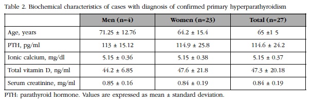 De las 13.860 personas evaluadas en el periodo del cribado, se encontró HPTP en 27 casos. Se excluyeron los pacientes (n=13.378) con elevación de la creatinina sérica y/o que estaban recibiendo tratamientos que afecten el metabolismo fosfocalcico (estrógenos, bisfosfonatos, litio, calcio, tiazidas). Fueron excluidos también los pacientes con creatinina sérica normal y sin tratamiento pero que tenían niveles normales de calcio iónico y PTH sérica. En 482 casos se encontró la PTH elevada en al menos una ocasión de varias sucesivas; 61 casos presentaron elevación de PTH en dos o más ocasiones, pero 34 de ellos tenían valores de VD total en rango de insuficiencia y fueron excluidos. En los 27 casos restantes, se confirmó el diagnostico bioquímico de HPTP por la elevación de PTH en dos o más ocasiones (IC 95%: 105,01-124,18), función renal conservada (IC 95%: 0,765-0,915) y suficiencia de VD total (≥30 ng/ml) (IC 95%: 39,12-55,09). En 25 casos (93%) el calcio iónico estaba en rangos normales (IC 95%: 5,0-5,29) y solo 2 (mujeres) presentaron valores mínimamente elevados (5,89 y 5,95 mg/dl, respectivamente).