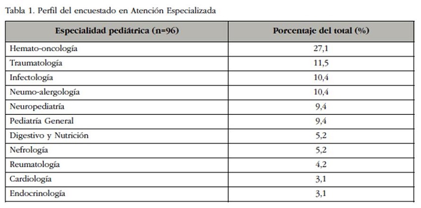 Participaron 420 profesionales, 324 pediatras de AP y 96 de diferentes especialidades pediátricas. La especialidad pediátrica de los profesionales encuestados del ámbito hospitalario se muestra en la tabla 1.