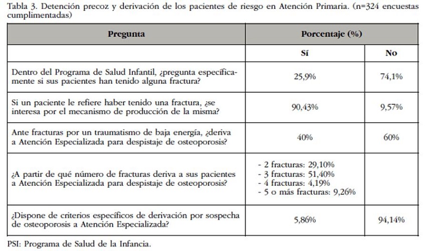En cuanto a la detección de pacientes con riesgo de osteoporosis en AP, sólo el 25,93% de profesionales preguntaba específicamente por la existencia de fracturas dentro del Programa de Salud Infantil. El 90,43% refería valorar el mecanismo etiopatogénico y el 40% reconocía derivar a AE a los pacientes con fracturas por traumatismos de baja energía. El 94,2% admitía no tener criterios específicos de derivación ante la presencia de osteoporosis (Tabla 3).