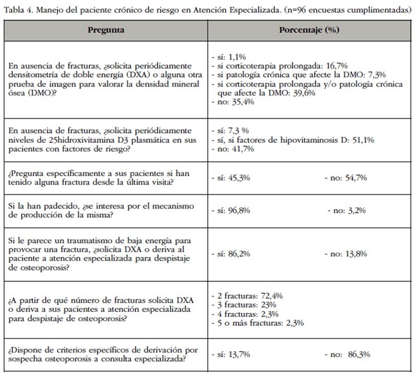 Con respecto al manejo del paciente crónico en Atención Especializada, el 39,6% refería solicitar una densitometría de doble energía (DXA) en caso de corticoterapia prolongada o enfermedad crónica que afectara al hueso aunque no existieran fracturas, y el 49,7% no monitorizaba los niveles de 25-OH-vitamina D en pacientes con factores de riesgo. El 86,2% solicitaba DXA o derivaba a Reumatología o Endocrinología ante fracturas por traumatismos banales. El 13,7% reconocía tener criterios específicos de derivación ante la presencia de osteoporosis (Tabla 4).