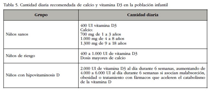 En lo referente a los suplementos de calcio, múltiples estudios restringen su uso a los individuos con aportes insuficientes a través de la dieta, no respaldando la suplementación sistemática ni en niños sanos ni con osteoporosis si tienen un aporte adecuado 19) (20) (21) (22. Del mismo modo, no existen datos que nos permitan recomendar sistemáticamente la suplementación con vitamina D 23) (24. Sin embargo, sí que se recomienda la suplementación con calcio y/o vitamina D cuando el aporte de estos elementos es bajo de forma basal. Los niveles adecuados de vitamina D3 (25-OH Vitamina D) en la infancia se sitúan entre los 20 y los 30 ng/ml (75-50 nmol/l), aunque recientes estudios sitúan los niveles óptimos por encima de los 30 ng/ml (75 nmol/l) 27) (28. La cantidad diaria recomendada de vitamina D3 y calcio se muestra en la tabla 5. En el caso de la vitamina D podemos medir sus niveles plasmáticos (25-OH vitamina D), mientras que el aporte de calcio deberá ser estimado mediante encuesta dietética. En nuestro estudio sólo la mitad de los pediatras de AP y el 86% de AE referían pautar suplementos de calcio y vitamina D en estas situaciones. Dicha suplementación conlleva la necesidad de controlar sus niveles plasmáticos y de detectar posibles complicaciones, como hipercalciuria, litiasis renal o complicaciones cardiovasculares 29) (30. En nuestro estudio, es destacable que la mayoría de pediatras de ambos grupos no realizaba monitorización analítica ni seguimiento con exploraciones complementarias durante el tratamiento.