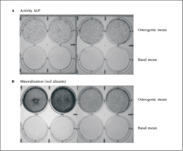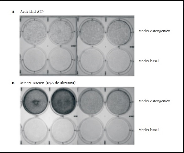 Se utilizó el medio de diferenciación osteogénico de linaje celular para evaluar el potencial de diferenciación osteogénica de ASC. Para dicha diferenciación las ASC se cultivaron durante 14 días en presencia de DMEM (Dulbecco's Modified Eagle's medium) con 10% FBS, 10-8 M de dexametasona, 0,5 mg/ml de ácido ascórbico y 0,1 M de b glicerolfosfato (Sigma-Aldrich; St. Louis, Missouri, EE.UU.). El medio se reemplazó cada 3 días, y al finalizar el periodo de 14 días se realizó la tinción histoquímica rojo de alizarina para revelar y cuantificar el número de células por campo microscópico rodeadas por matriz extracelular mineralizada teñida con rojo de alizarina. Así mismo se realizó una comprobación de la diferenciación osteoblástica mediante ensayo de actividad de la fosfatasa alcalina (ALP), que consistió en la identificación de los depósitos teñidos de rojo que indican actividad fosfatasa alcalina mediante el kit 86R de Sigma Aldrich. ASCs de seis pacientes diferentes se utilizaron en cada ensayo.
