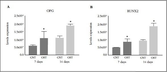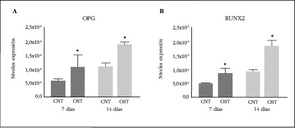 Se evaluó la expresión génica de algunos de los marcadores de diferenciación osteogénica como OPG y Runx2 [12,13,24]. Se observó que la expresión de estos dos marcadores analizados aumentó significativamente (p<0,05) tras 14 días de cultivo con el medio de diferenciación osteogénica (Figura 2A-B).
