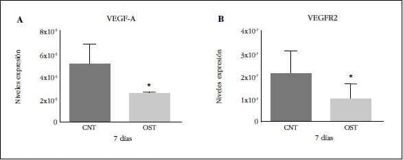 Se evaluó la expresión génica del sistema VEGFA y su receptor inducido por la diferenciación osteogénica. Tal y como se puede observar en la figura 3, tras 7 días de diferenciación las células disminuyen significativamente la expresión del VEGF y de su receptor tipo 2.
