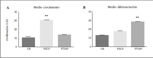 Los ensayos de proliferación celular con medios suplementados con PTHrP y VEGF mostraron resultados diferentes. Se realizó un estudio de proliferación de las ASCs en respuesta a VEGF (160 pM) durante 24 horas en condiciones basales (medio de crecimiento) o con medio de diferenciación osteogénica.