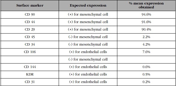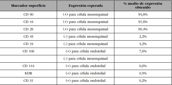 En primer lugar, se llevó a cabo la caracterización de las ASCs procedentes del cultivo primario de los lipoaspirados. El análisis fenotípico de ASC por citometría de flujo reveló que 99,6% eran CD90+, 91,6% CD44+, 90,4% CD29+, 4,2% CD34+, 2,2% CD45+. Además, se analizaron los marcadores CD106, CD155, KDR y CD31, todos ellos de expresión negativa para ASCs (Tabla 1).