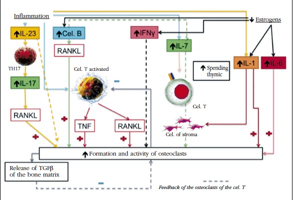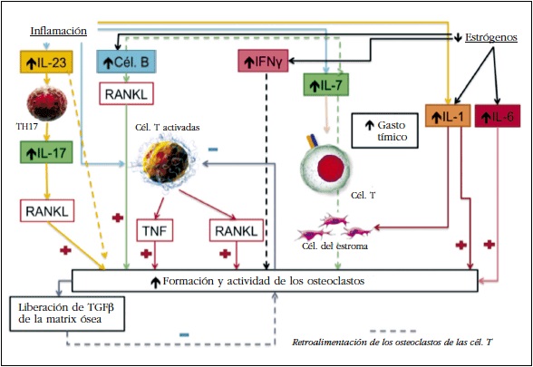 Los determinantes de la inflamación sobre el hueso son las citoquinas proinflamatorias. Así, el factor de necrosis tumoral alfa (TNF-α), las interleuquinas (IL) 1 y 6 (IL-1 e IL-6) favorecen la resorción ósea, al promover directa o indirectamente la osteoclastogénesis. La IL-17 aumenta la expresión del ligando del receptor activador para el factor nuclear κ B (RANK-L), que a su vez es parte fundamental del proceso de resorción ósea (Figura 1).