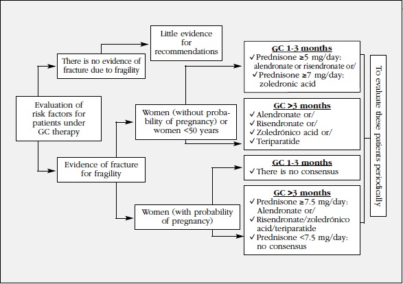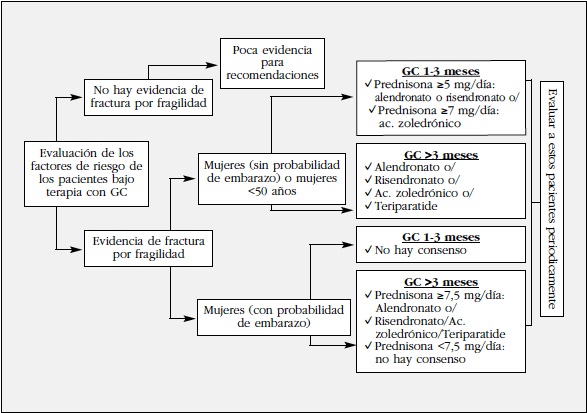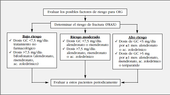 En los pacientes que inicien tratamiento con glucocorticoides durante más de 3 meses a dosis >5 mg/día, es necesario instaurar tratamiento preventivo de pérdida de masa ósea, y en aquellos pacientes que ya están siendo tratados se debe realizar una densitometría ósea, con el fin de valorar la reducción de masa ósea y el posible riesgo de fractura [17,49].