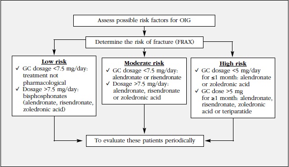 La OIG es la causa más común de osteoporosis secundaria. Se ha demostrado que el tratamiento prolongado con 2,5-5 mg diarios de prednisolona eleva el riesgo de fractura vertebral y de cadera [16,44].