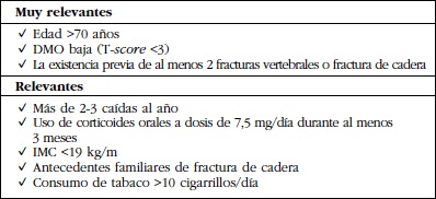 - Claves: edad superior a los 70 años, antecedentes de fractura previa por fragilidad (vertebral o de cadera), ingesta de glucocorticoides (7,5 mg/día durante 3 meses o más) y DMO (T-score ≤3).