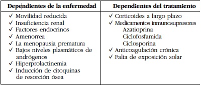 El LES es una enfermedad autoinmune de origen desconocido que se presenta con mayor frecuencia en mujeres jóvenes [4]. La osteoporosis es también una enfermedad asociada, y probablemente causada por los tratamientos que generan un efecto negativo sobre el hueso o por disfunción ovárica inducida por algunos inmunosupresores [24].