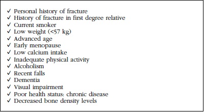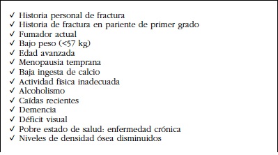 - Importantes: antecedentes maternos de fractura de cadera, IMC ≤20, caídas frecuentes en personas de edad avanzada, mediciones bajas en actividad y función física.