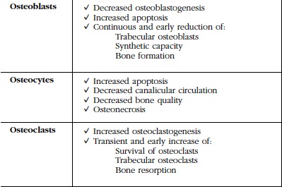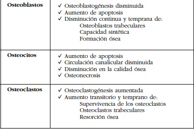 En cuanto a la formación ósea, esta se ve afectada debido a la inhibición de las células precursoras de osteoblastos y a un aumento de la apoptosis osteoblástica [45]. Además, se produce una inhibición de la función de los osteoblastos maduros y una supresión de los factores de crecimiento (IGF1) en las células óseas, junto con un aumento de la apoptosis de los osteocitos [47,48] (Tabla 5).