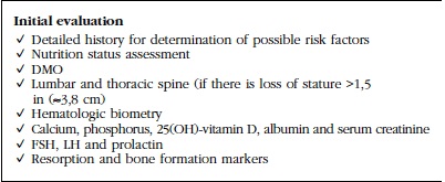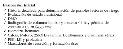 Los pacientes con osteoporosis deben ser investigados de acuerdo a las posibles causas que desencadenan la pérdida de masa ósea (Tabla 6). Durante el examen físico es importante medir la altura del paciente y comparar con mediciones anteriores, con el fin de evaluar posibles fracturas vertebrales asíntomáticas.