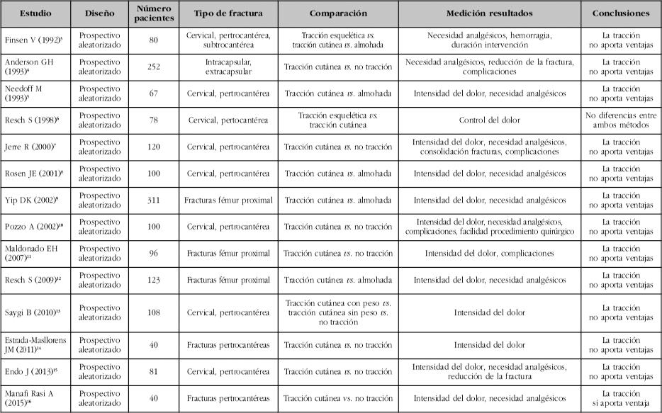 Únicamente hemos encontrado un artículo que recomiende el uso de la tracción16. Analizó solamente 40 pacientes con fracturas intertrocantéricas y sólo en las primeras 24 horas. De las 5 mediciones del dolor que se realizaron en pacientes con y sin tracción, únicamente en una de ellas, al final del día, existió una diferencia significativa a favor de los pacientes con tracción. Los autores reconocieron que no hubo una mayor demanda de analgesia en ninguno de los dos grupos. Pese a los discretos resultados del trabajo, recomendaron el uso de la tracción para proporcionar “un mayor confort y relajación”.