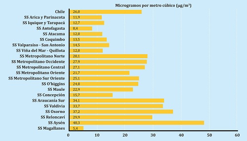 En Chile, el MP2,5 y otras variables de calidad del aire se miden diariamente en estaciones monitoras de calidad del aire. El año 2017, de las 31 estaciones de monitoreo con representatividad poblacional (que representan a más de 10 millones de habitantes de los 17,5 millones de habitantes que tiene Chile), 22 de ellas (69% del total) presentaron concentraciones superiores al valor habitual primario anual para MP2,5 (20 g/m3)7. Ese mismo año, más de 8 millones de habitantes de Chile (cifras cercanas al 50% de la población) se vieron expuestas a concentraciones promedio de MP2,5 superiores al valor habitual. En la zona central de Chile, donde hay más de 7 millones de habitantes, las concentraciones promedio de MP2,5 llegan a las 29 g/m3. Hacia el sur de Chile las concentraciones aumentan considerablemente, siendo la ciudad de Coyhaique, que tiene alrededor de 61 mil habitantes, la ciudad más contaminada de Latinoamérica al estar expuesta a las mayores concentraciones promedio de MP2,5 (57 g/m3)7.