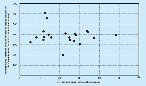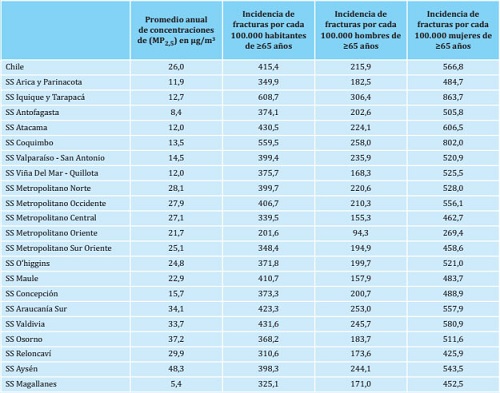 El único estudio en Latinoamérica que evalúa la asociación entre la contaminación del aire y la patología osteoporótica se efectuó en Chile, analizando la asociación entre las altas hospitalarias desde el año 2005 al año 2011 y el material particulado, encontrándose que no hay asociación estadísticamente significativa entre la contaminación atmosférica y la incidencia promedio anual de fractura de cadera osteoporótica en Chile; sin embargo, se utilizaron los datos de algunas ciudades y no los datos correspondientes a los Servicios de Salud de Chile, por lo que gran cantidad de altas hospitalarias quedaron fuera del estudio8.