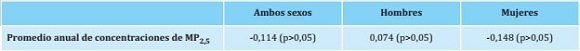 Respecto a la asociación entre la concentración promedio anual de MP2,5 por SS y la tasa de incidencia anual de fracturas de cadera osteoporóticas por SS, analizando en hombres, mujeres y en ambos sexos: no se encontró asociación entre las variables, pues el coeficiente de correlación de Pearson (r) es muy débil 0,2>r>0 (Tabla 2).