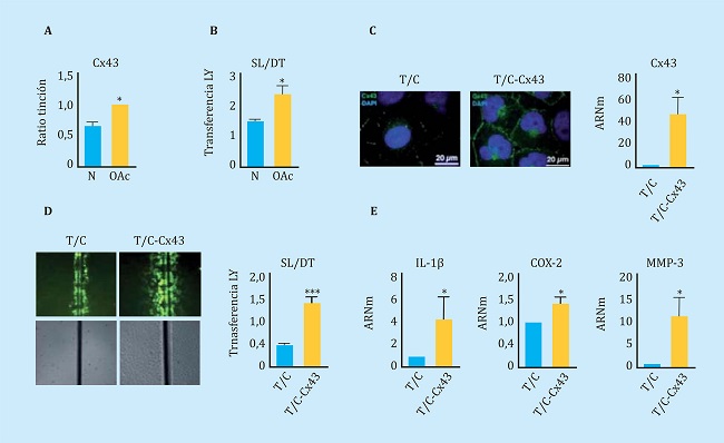 En concordancia con lo observado en tejido 6, los condrocitos articulares en cultivo primario procedentes de donantes con OA (OAc) presentaron niveles de Cx43 significativamente mayores que aquéllos aislados de donantes sanos (N) detectados por citometría de flujo ( Figura 1A). Los niveles elevados de Cx43 se correlacionaron con mayores niveles de comunicación intercelular a través de UCs, cuantificada mediante un ensayo SL/DT de transferencia de LY ( Figura 1B). Con el objetivo de estudiar el efecto en el fenotipo celular de niveles elevados de la Cx43 y de comunicación intercelular a través de UCs, se utilizó como modelo de estudio una línea celular de condrocitos de una donante sana, T/C-28a2. La Cx43 fue sobreexpresada utilizando un vector con el gen de la Cx43 humana bajo el promotor del CMV 24 ( Figura 1C). El incremento de la Cx43 en la línea celular de condrocitos humanos T/C-28a2 se correlacionó con un aumento de la actividad de las UCs detectada por el ensayo SL/DT ( Figura 1D). El ensayo de expresión génica mediante RT-PCR mostró un incremento significativo en la expresión génica de interleuquina 1-β (IL-1β), ciclooxigenasa-2 (COX-2) y metaloproteasa-3 (MMP-3) cuando la Cx43 fue sobreexpresada en la línea de condrocitos sana (T/C – Cx43) ( Figura 1E).