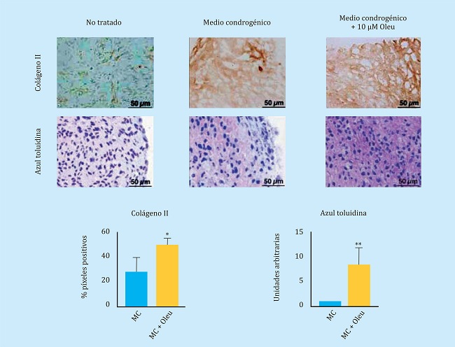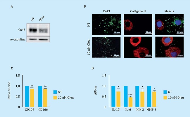 Con el objetivo de disminuir la actividad de la Cx43 en OAc, se estudió el efecto de diferentes moléculas en los niveles y actividad de la Cx43. En este estudio, observamos que el polifenol oleuropeína disminuye los niveles de la Cx43 en OAc ( Figura 3A). La disminución de los niveles de la Cx43 mejoró el fenotipo del condrocito OA detectado por un incremento en el principal marcador de condrocitos articulares, el colágeno II ( Figura 3B). El tratamiento de OAc con una concentración de 10 µM de oleuropeína durante 7 días dio lugar a una disminución significativa de los niveles de marcadores de desdiferenciación CD105 y CD166 ( Figura 3C), así como de la expresión génica de IL-1β, IL-6, COX-2 y MMP-3 detectados por citometría de flujo y análisis de la expresión génica respectivamente (Figura 3D). El efecto de la Cx43 en plasticidad celular en OAc fue confirmado en cultivo 3D. La modulación de los niveles de Cx43 en presencia de oleuropeína 10 µM en micromasas y en medio condrogénico mejoró la estructura de la matriz extracelular, detectándose un incremento significativo en los depósitos de colágeno II y proteoglicanos en la matriz de la estructura 3D ( Figura 4).