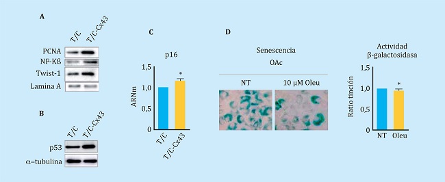 El análisis de niveles proteicos totales o nucleares se llevó a cabo mediante la técnica de Western blot. Cantidades equivalentes de proteínas fueron separados en geles de acrilamida desnaturalizantes al 10% y transferidas a una membrana de fluoruro de polivinilideno (PVDF). Tras el bloqueo con leche desnatada diluida en tris salino tamponado (TBS), las membranas fueron incubadas toda la noche a 4ºC con anticuerpos primarios anti α-tubulina (Sigma-Aldrich, T9026), Cx43 (Sigma-Aldrich, C6129) Twist-1 (SCBT, sc-81417), antígeno nuclear de proliferación celular o PCNA (SCBT, sc-56), p53 (SCBT, sc-126), factor nuclear potenciador de las cadenas ligeras kappa de las células B activadas o NF-Kß (SCBT, sc-8008) o Lamina A (SCBT, sc-20680). Después de la incubación con el anticuerpo primario, se lavaron las membranas con TBS y se incubaron con sus correspondientes anticuerpos secundarios marcados con peroxidasa de rábano (HRP) durante 1 hora a temperatura ambiente. Una vez eliminado el exceso de anticuerpo con TBS la señal se visualizó en una cámara de revelado LAS-3000 (Fujifilm).