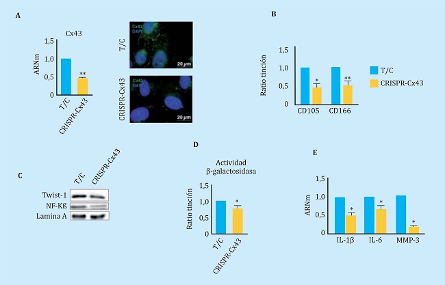 La sobreexpresión de la Cx43 en la línea de condrocitos T/Cx28a2, se correlacionó con un incremento en el núcleo de PCNA, proteína utilizada como marcador de proliferación celular, y con activación del factor de transcripción relacionado con TEM, Twist-1, detectado por translocación e incremento de los niveles del factor de transcripción a nivel nuclear ( Figura 5A). Los condrocitos transfectados para sobreexpresar la Cx43 también mostraron mayores niveles nucleares de NF-kß, uno de los factores de transcripción más importantes en la regulación de síntesis del componente SASP ( Figura 5A). Niveles elevados de la Cx43 se correlacionaron con elevados niveles de los factores implicados en senescencia celular p53 ( Figura 5B) y p16 ( Figura 5C). El tratamiento de OAc con oleuropeína 10 µM redujo los niveles de Cx43 ( Figura 3A) y de senescencia celular detectada por la actividad β-galactosidasa mediante microscopía óptica y por citometría de flujo ( Figura 5D). Con el objetivo de confirmar el efecto de la disminución de Cx43 en TEM y senescencia celular, se transfectó la línea T/Cx28a2 con un plásmido CRISPR/Cas9, obteniendo células heterocigotas para el gen de la Cx43 ( Figura 6A). Niveles reducidos de Cx43 en la línea T/C-28a2 se correlacionó con una disminución significativa de los marcadores “stem-like” CD166 y CD105 ( Figura 6B). La disminución de los niveles de Cx43 en estas células, desencadenó en una disminución en los niveles de los factores de transcripción Twist-1 (TEM) y NF-kß (SASP) a nivel nuclear ( Figura 6C), disminuyendo los niveles de senescencia celular, detectada mediante actividad β-galactosidasa y citometría de flujo ( Figura 6D). Los condrocitos T/Cx28a2 con bajos niveles de Cx43 (CRISPR-Cx43) mostraron niveles significativamente menores de síntesis de los mediadores pro-inflamatorios IL-1β e IL-6, y de la proteasa MMP-3, con respecto a la línea T/Cx28a2 sin transfectar.