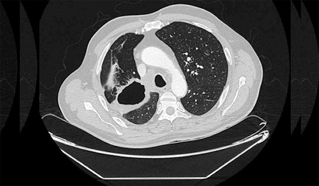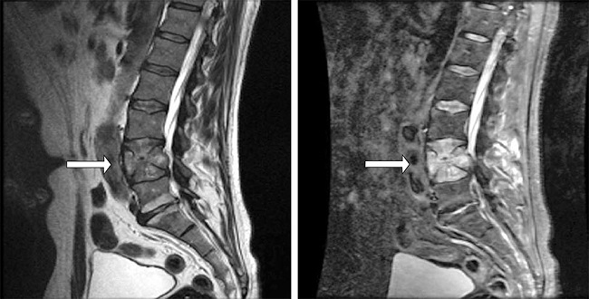 Paciente de 58 años con artritis reumatoide en remisión con metotrexate a dosis de 10 mg/semanales. Acude a Urgencias hospitalarias en varias ocasiones por episodio de lumbalgia aguda de un mes de evolución. En la radiografía lumbar hay una fractura transversal L4 con retropulsión de muro posterior ( Figura 1) que pasa desapercibida. La lumbalgia se hace incapacitante con pérdida de función de la pierna izquierda. Se realiza resonancia magnética lumbar en T2 y STIR ( Figuras 2a y 2b), que muestra fractura aguda-subaguda de soma vertebral L4 con edema de pedículos y moderado desplazamiento intracanal de la mitad inferior del muro posterior que comprime la raíz nerviosa eferente izquierda y ocupa parcialmente el receso lateral. Con la sospecha de etiología tumoral, ingresa para estudio. En el TAC torácico aparece una gran tumoración cavitada en lóbulo superior derecho que comunica con bronquio principal ipsilateral asociado a neumonitis y bronquiectasias perilesionales ( Figura 3). El estudio histológico de la lesión pulmonar fue de carcinoma de pulmón de célula grande PD-L1 positivo 80%. Se realizó vertebroplastia. Inició tratamiento con pembrolizumab con buena respuesta hasta el momento. La artritis reumatoide se mantiene en remisión a pesar del tratamiento con anti PDL1.