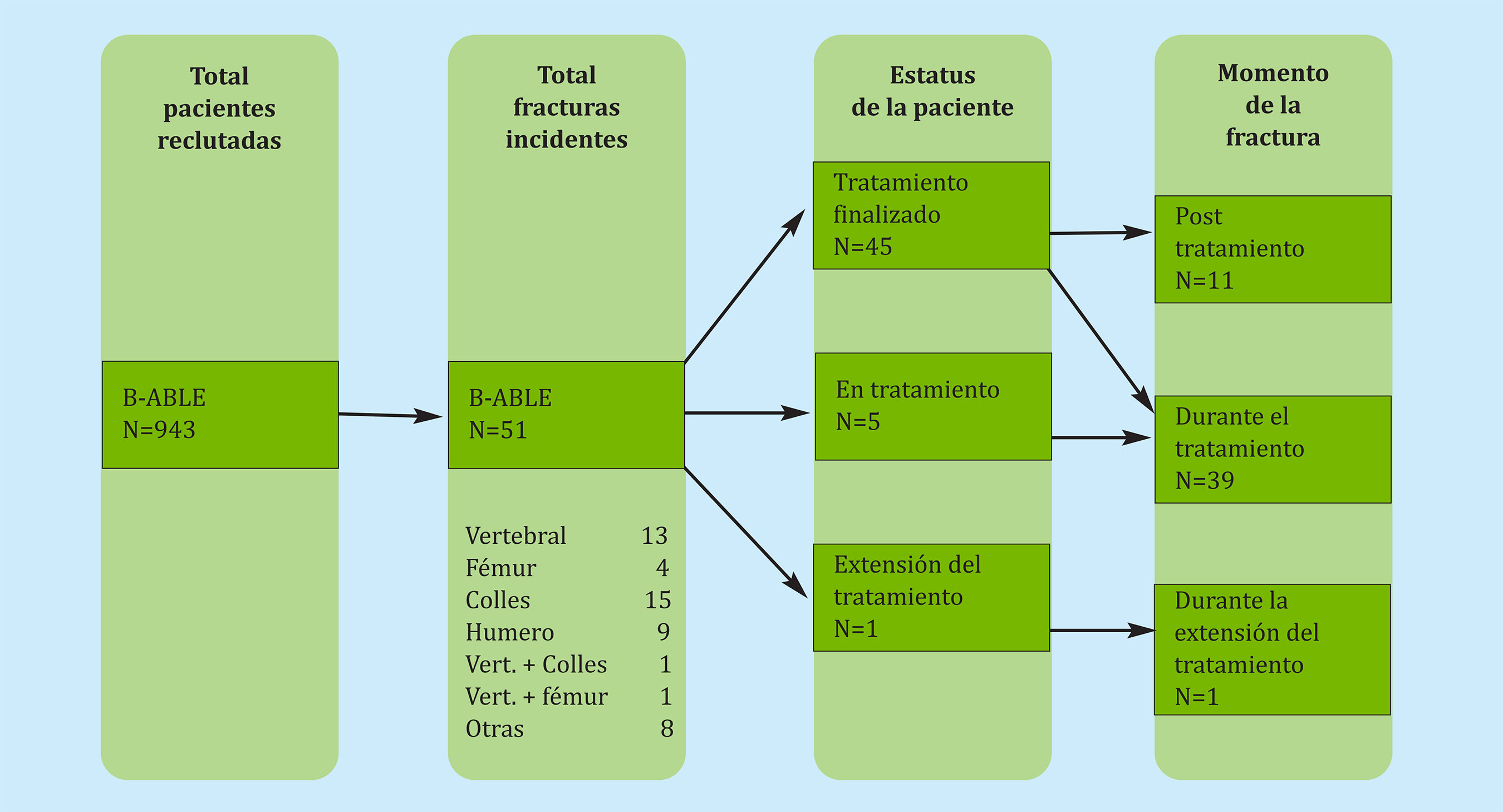 Un total de 943 pacientes fueron incluidas en el estudio. El 5,4% sufrieron una fractura incidente, la mayoría durante el tratamiento con IA, aunque un 21,5% ocurrieron durante el primer año después de finalizar la terapia. La mayoría de las fracturas incidentes fueron vertebrales clínicas (29,4%) y de Colles (31,4%). El 86,3% de las pacientes tenían un diagnóstico de osteopenia u osteoporosis en el momento de la fractura y el 33% tenían los niveles de -CTX (isómero del telopéptido carboxiterminal del colágeno tipo I) por encima de la normalidad.