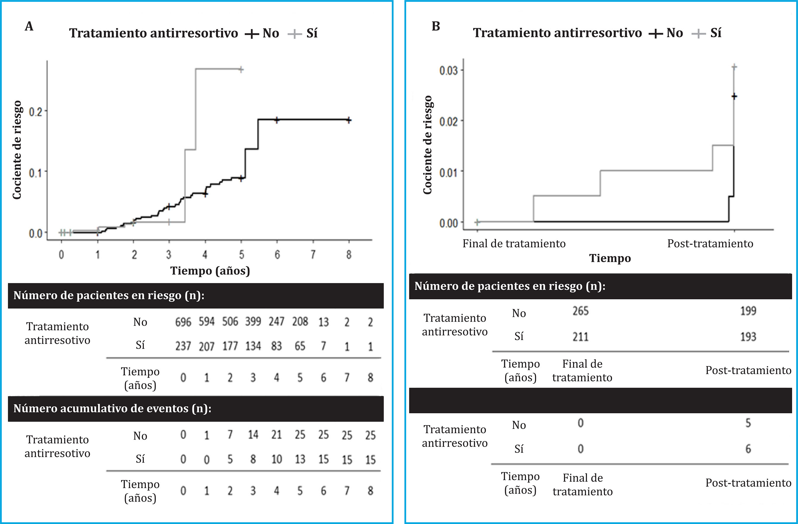 Un 86,3% de las pacientes tenían diagnóstico de osteopenia u osteoporosis en el momento de la fractura, siendo un factor de riesgo clave para la fractura asociada a los IA. No se encontraron diferencias significativas en el riesgo de fractura entre pacientes con y sin tratamiento antirresortivo: HR=1,75 [IC 95%: 0,88 a 3,46] (Figura 2). Cabe destacar que las pacientes con fracturas incidentes tratadas con bisfosfonatos tenían un IMC significativamente menor que las pacientes con fractura y sin bisfosfonatos [media (DE): 26,4 (6,2) vs. 30,9 (5,2), respectivamente; p=0,01]. No se encontraron diferencias en los otros parámetros analizados: edad, quimioterapia previa y caídas previas.