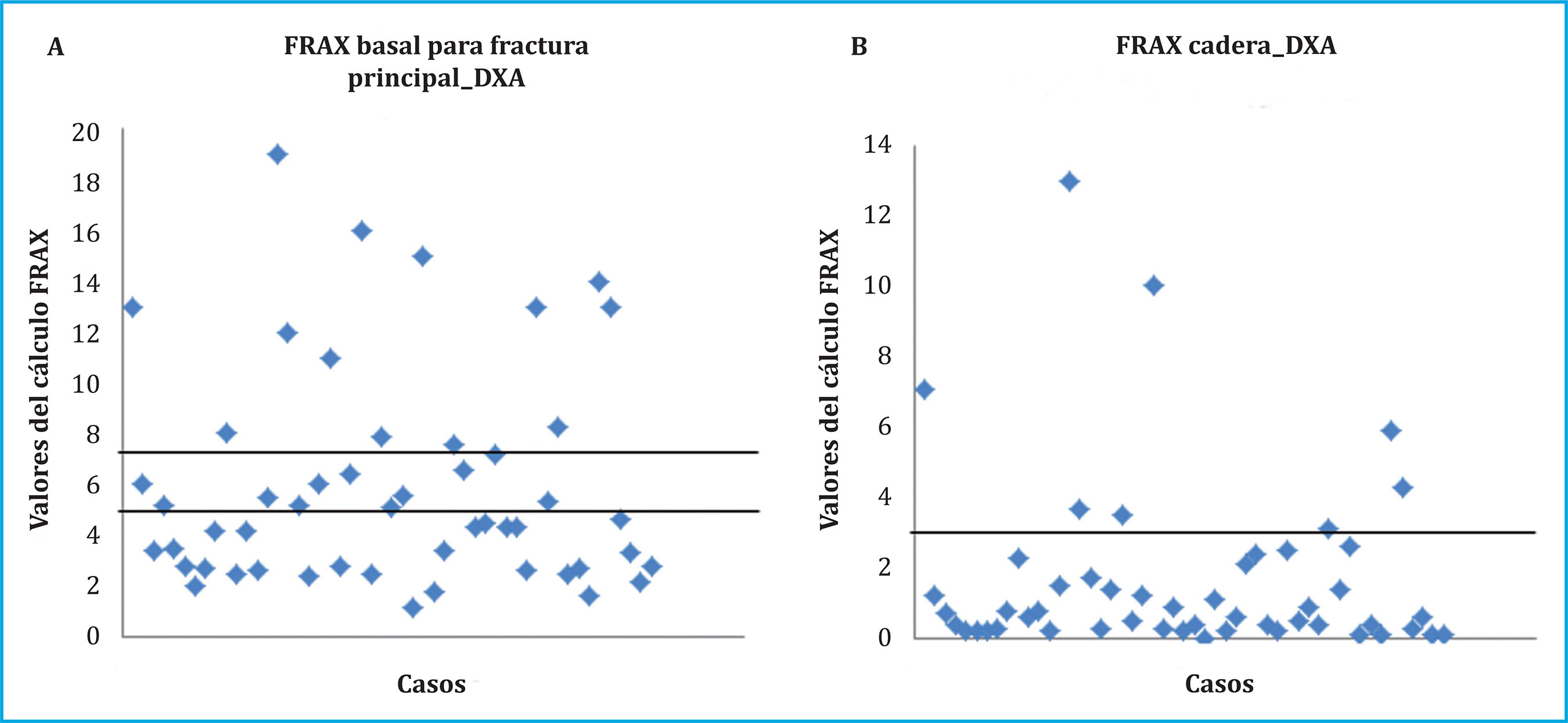 El cálculo del riesgo absoluto de fractura osteoporótica mayor y de cadera en los próximos 10 años, utilizando la herramienta FRAX en las pacientes con fracturas incidentes, se muestra en la tabla 2. Se detectaron valores de FRAX de alto riesgo de fractura principal (7,5) y de fractura de cadera (3) en 13 y 8 pacientes, respectivamente (Figura 4). Además, al comparar las medias con las pacientes de la B-ABLE sin fractura incidente (Tabla 3), la media de FRAX en las pacientes con fractura era más elevada que las pacientes sin fractura.