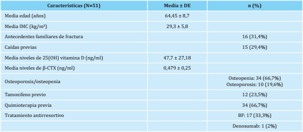 Conclusiones: El principal factor de riesgo detectado para fractura incidente en pacientes tratadas con IA es el diagnóstico de osteopenia u osteoporosis. El cálculo de la herramienta FRAX y la determinación de los niveles de -CTX son herramientas útiles para identificar a pacientes de alto riesgo.