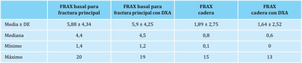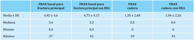 Las pacientes diagnosticadas de osteoporosis o con riesgo de fractura al inicio del estudio fueron tratadas con antirresortivos óseos. No se encontraron diferencias significativas en el riesgo de fractura entre pacientes con y sin tratamiento antirresortivo: HR=1,75 [IC 95%: 0,88 a 3,46]. Tampoco se encontraron diferencias entre las pacientes que habían hecho tratamiento previo con tamoxifeno respecto a las que no (HR=1,00 [IC 95%: 0,39 a 2,56]). La herramienta FRAX dio valores de media dentro del rango de riesgo intermedio, con 13 pacientes con valores de alto riesgo de fractura principal.