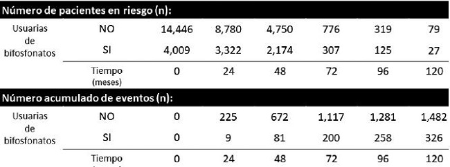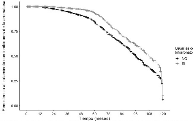 Material y método: Se recolectaron datos de mujeres tratadas con IA entre enero de 2006 y diciembre de 2015 en la base de datos SIDIAP, un registro de atención primaria que incluye datos del 80% de la población de Cataluña. Se excluyeron aquellas tratadas previamente con tamoxifeno. Se estudió la persistencia al tratamiento con IA con un análisis de supervivencia: se calculó el estimador de Kaplan-Meier, y se realizó un modelo de los riesgos proporcionales (regresión de Cox) entre usuarias y no usuarias de BF ajustando por edad. Se comparó la diferencia de mortalidad entre grupos mediante una prueba Chi cuadrado.