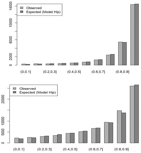 La discriminación valorada mediante el estadístico C fue de 85% para cadera y 84% para fractura principal. La calibración fue excelente en ambos modelos y en subgrupos ( Figura).