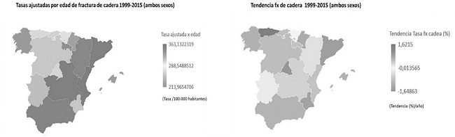 Conclusión: En España, la tasa ajustada por edad de la incidencia de fractura de cadera está disminuyendo en mujeres y permanece estable en hombres. Se observa un fenómeno de regresión a la media, por el que CCAA con tasas elevadas de incidencia presentan una tendencia negativa y viceversa.