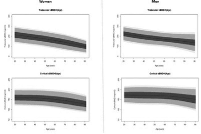 Resultados: Se ha efectuado una selección de los resultados priorizando los relacionados con las variables más importantes. Las curvas relacionadas con la edad obtenidas se presentan en la Figura. Entre los 20 y 90 años, se advierte disminución de los parámetros de vDMO trabecular y sDMO cortical que expresada en porcentaje, fue de -50,8% y -18,7% respectivamente en mujeres y -36,6% y -11,5% respectivamente en hombres. A los 20 años, los hombres presentan sDMO y grosor cortical significativamente mayor (+8,6 y + 7,2%) y vDMO trabecular ligeramente superior (+4,1%) en comparación con las mujeres. La disminución de vDMO trabecular, en ambos sexos, tuvo una tendencia lineal en el rango de edad estudiado, si bien, en el compartimiento cortical se observa un proceso de dos ritmos; es decir, una meseta seguida de una disminución lineal (ver Figura). El comienzo de esta disminución cortical comienza antes en las mujeres que en los hombres (45 vs. 60 años).