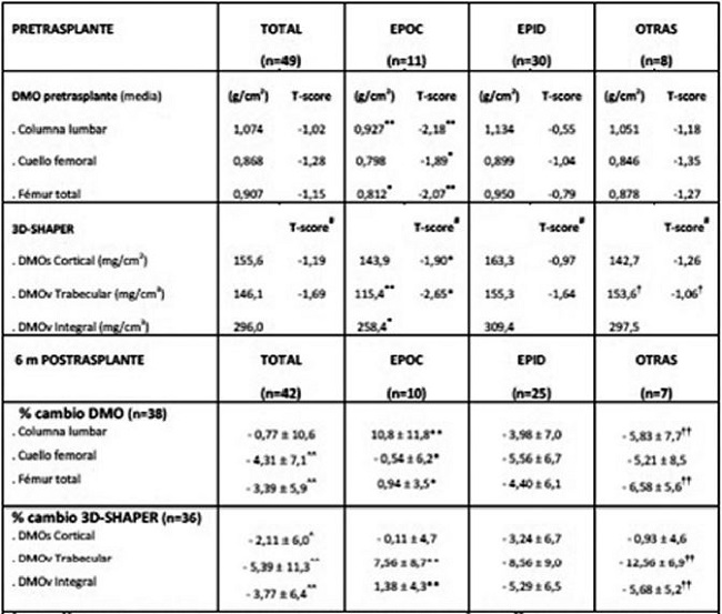 Resultados: Incluimos 49 pacientes TxP (46,9% mujeres), con una media de edad de 56,9±8,7 años. En el grupo EPID se observó una mayor proporción de pacientes con una baja ingesta de calcio y con dosis elevadas de GC. El grupo EPOC presentó mayor proporción de fumadores. La prevalencia de osteoporosis previa al TxP fue del 24,5%, superior en los EPOC. Los valores de DMO y del 3D-SHAPER así como el porcentaje de variación postrasplante se muestran en la Tabla. De los 47 pacientes, 19 (38,8%) iniciaron tratamiento osteactivo antes del TxP, siendo el grupo EPOC el más tratado. De 42 pacientes disponemos de DXA a los 6 meses postrasplante, con una prevalencia de osteoporosis del 23,8%. 27 pacientes seguían tratamiento osteoactivo postrasplante.
