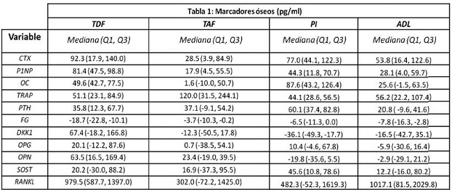 Resultados: La media de edad de la cohorte joven fueron 34,9 años (19-50 años), en la etapa A de CDC (91%), con mediana de CD4 de 481 células/μL (RIC=339,5), donde el 10% tenía CD4 <200 células/μl y el 42% tenía CD4/CD8 <0,4. El 71% tenía niveles bajos de vitamina D, un 4% de IMC bajo (<18,5). Osteopenia u osteoporosis se encontró en el 53% y el 11% de los pacientes, respectivamente. Observamos que tanto el TDF como el TAF presentaron un perfil óseo catabólico más notable que otros fármacos antirretrovirales, sin diferencias significativas entre TDF y TAF a los 12 meses ( Tabla). Sin embargo, hemos observado un aumento en CTX, P1NP y DKK1 para TDF siendo mayor que para TAF y los otros tratamientos.