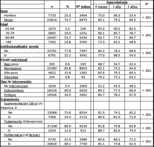 Conclusiones: Los hombres tienen más diabetes, insuficiencia cardíaca, EPOC, cardio- patía isquémica, AVC, insuficiencia renal crónica y cirrosis que las mujeres, y las mujeres tienen más artrosis, osteoporosis, depresión y demencia que los hombres. De la muestra del estudio, el 42,9% corresponden al grupo de fracturas intracapsulares y el 55% al de extracapsulares. En relación con el tratamiento de prevención secundaria para la osteoporosis, tenían prescrita la suplementación con calcio y vitamina D el 5,8% de la totalidad de los casos, y se encontraban en tratamiento farmacológico antirresortivo o osteoformador el 4,7%.