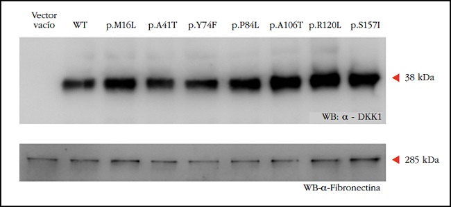 Material y métodos: Se realizaron estudios in vitro del gen reportero luciferasa para medir la actividad de la vía de Wnt en presencia o ausencia de DKK1 silvestre o mutada, y estudios de western blot, para evaluar si las distintas mutaciones afectan a su síntesis y/o a su estabilidad.
