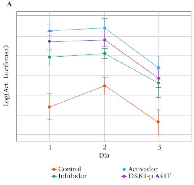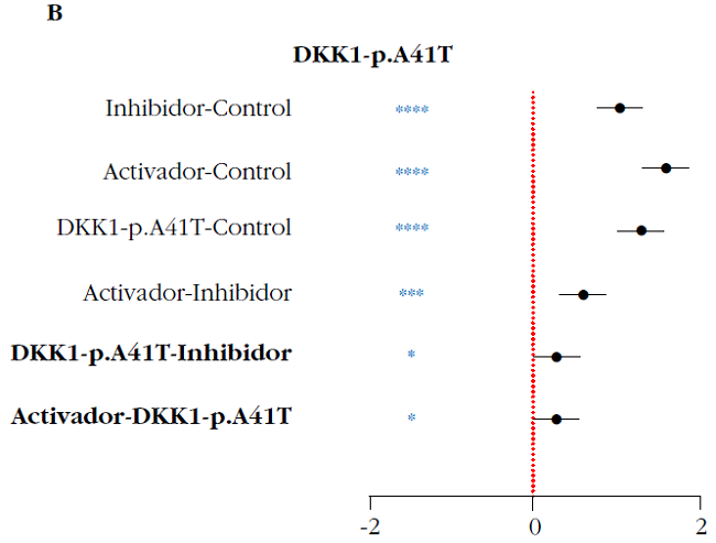 Resultados: La proteína DKK1 con la variante p.Ala41Thr presenta menor actividad inhibidora de la vía en comparación con la proteína silvestre. También se observaron diferencias significativas entre los experimentos realizados en ausencia de DKK1 y los que incluyen DKK1 con la mutación p.Ala41Thr. Los western blots mostraron que la cantidad de proteína era similar para todas las variantes, tanto las mutadas como la silvestre, por lo que la pérdida de actividad de p.Ala41Thr no parecía deberse a falta de proteína. El resto de las mutaciones no presentaron un comportamiento diferente al de la proteína DKK1 silvestre.