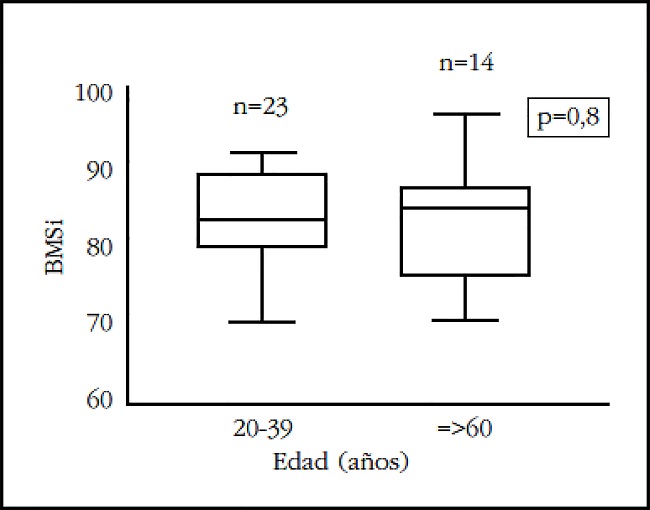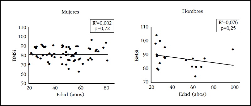 Resultados: Los análisis de regresión lineal mostraron que la BMSi no se correlaciona con la edad en varones (R2=0,0016, p=0,74) ni en mujeres (R2=0,076, p=0,25). Asimismo, el análisis ajustado de ANOVA no demostró asociación entre la BMSi y la edad ni en varones (p=0,78) ni en mujeres (p=0,73). Finalmente, no se encontraron diferencias entre la BMSi entre las mujeres más jóvenes y las mayores (p=0,8).
