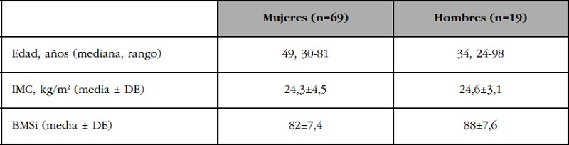 Para el estudio se reclutaron 69 mujeres y 19 varones de origen caucásico. Las características de los participantes y las mediciones de BMSi se exponen en la tabla 1. El coeficiente de variación interoperador fue menor del 5%.