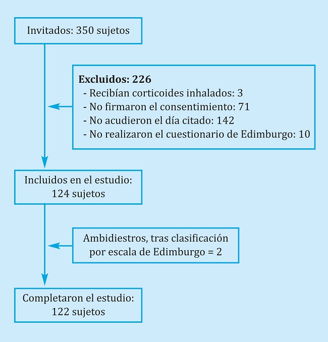 Participaron en el estudio 122 sujetos voluntarios. En la figura 1 se muestra el proceso de selección de los participantes.