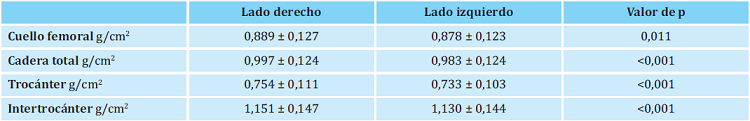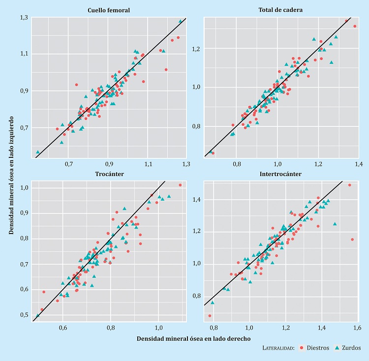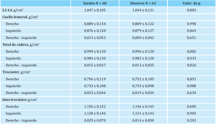 Resultados: De los 122 sujetos estudiados, 62 eran diestros y 60 zurdos. No se observaron diferencias estadísticamente significativas entre los casos y controles en la edad, proporción de varones y mujeres, índice de masa corporal y distribución de los estilos de vida: consumo de alcohol, tabaco y actividad física en el tiempo libre. Los zurdos y los diestros mostraron valores similares de densidad mineral ósea en la columna y en todas las localizaciones anatómicas medidas (cuello femoral, total de cadera, trocánter e intertrocánter) de ambos fémures, derecho e izquierdo. Sin embargo, en el fémur izquierdo se obtuvieron valores más bajos de DMO en comparación con el derecho en todas las localizaciones medidas (diferencias que fueron estadísticamente significativas) tanto al considerar a todos los sujetos juntos como al agruparlos según su lateralidad.