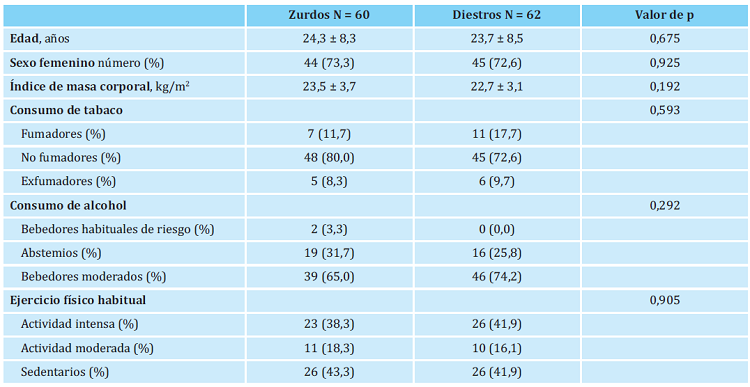 En la tabla 1 se recogen las características basales de los participantes en el estudio, 60 zurdos y 62 diestros. Dos sujetos ambidiestros fueron excluidos por las razones indicadas en material y métodos. Se trata de una población joven con una edad media de alrededor de 24 años (24,3 años vs. 23,7 años), con notable predominio del sexo femenino, pues aproximadamente el 73% de los participantes eran mujeres (73,3% en el grupo de zurdos vs. 72,6% en el de diestros). El índice de masa corporal (IMC) fue similar en ambos grupos, estando el mismo dentro de la normalidad. La mayor parte de los participantes eran no fumadores y bebían con moderación, sin observarse diferencias estadísticamente significativas entre los zurdos y diestros, con prevalencias similares. Asimismo, la mayor parte de los participantes eran sedentarios (más del 40% en ambos grupos) sin existir tampoco diferencias estadísticamente significativas entre ellos