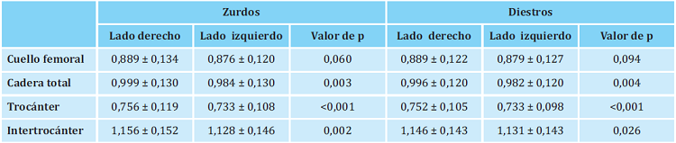 En la tabla 4 se muestran los resultados de dicha comparación en los grupos estudiados, zurdos y diestros, obteniendo que las diferencias eran significativas en todas las localizaciones excepto en cuello femoral, tanto en el grupo de los zurdos como en el grupo de los diestros.